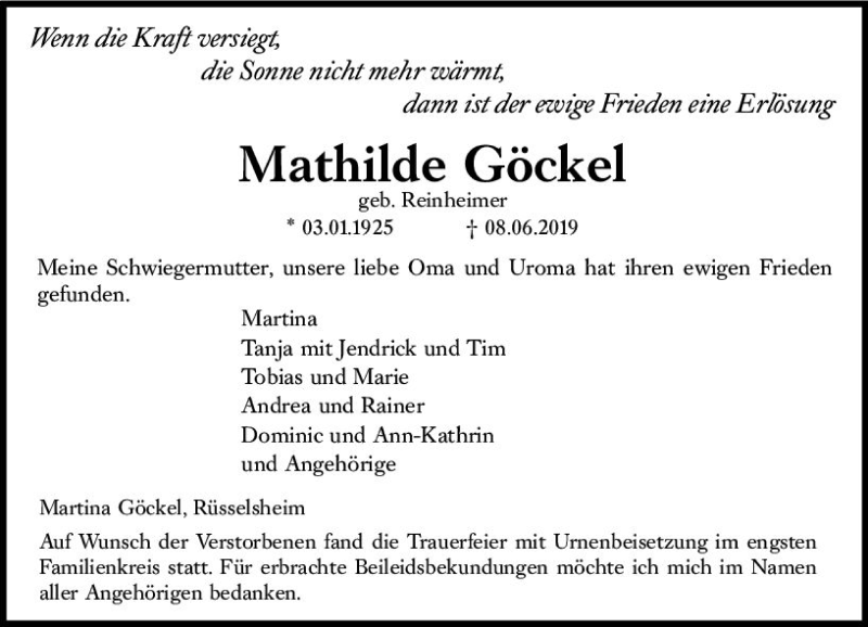 Hier finden Sie alle Traueranzeigen aus der Zeitung, die bisher für Mathilde Göckel erschienen sind. Weitere Traueranzeigen, die in der Zeitung erscheinen, werden hier ebenfalls aufgelistet