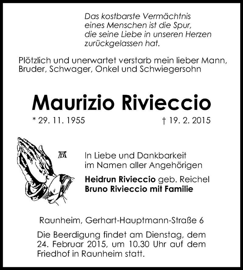 Hier finden Sie alle Traueranzeigen aus der Zeitung, die bisher für Maurizio Rivieccio erschienen sind. Weitere Traueranzeigen, die in der Zeitung erscheinen, werden hier ebenfalls aufgelistet