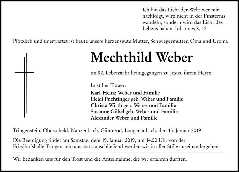 Hier finden Sie alle Traueranzeigen aus der Zeitung, die bisher für Mechthild Weber erschienen sind. Weitere Traueranzeigen, die in der Zeitung erscheinen, werden hier ebenfalls aufgelistet
