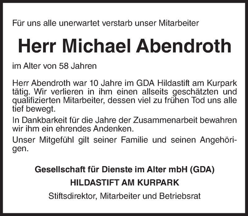 Hier finden Sie alle Traueranzeigen aus der Zeitung, die bisher für Michael Abendroth erschienen sind. Weitere Traueranzeigen, die in der Zeitung erscheinen, werden hier ebenfalls aufgelistet