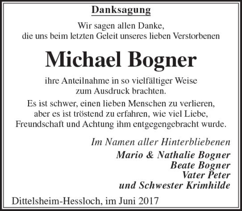 Hier finden Sie alle Traueranzeigen aus der Zeitung, die bisher für Michael Bogner erschienen sind. Weitere Traueranzeigen, die in der Zeitung erscheinen, werden hier ebenfalls aufgelistet