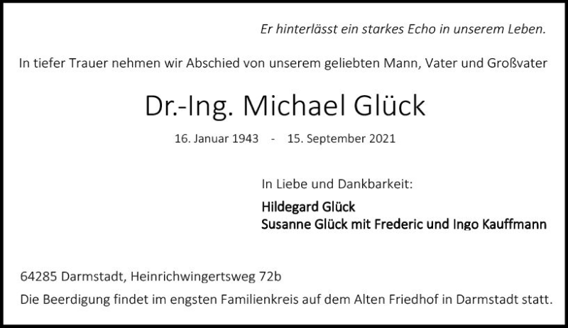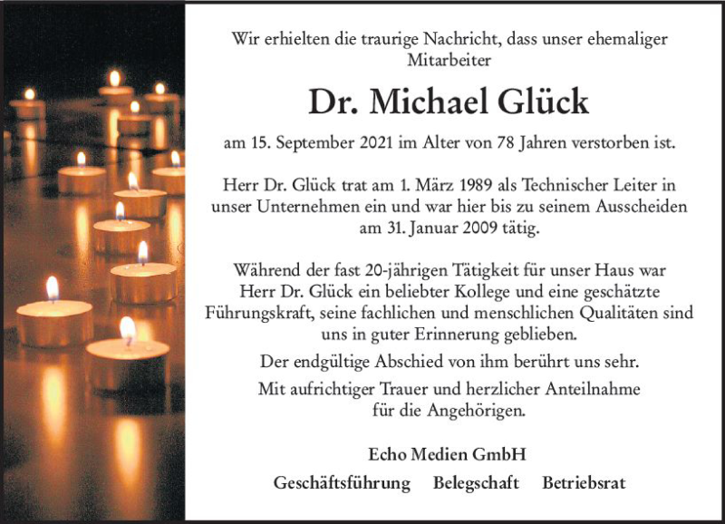 Hier finden Sie alle Traueranzeigen aus der Zeitung, die bisher für Michael Glück erschienen sind. Weitere Traueranzeigen, die in der Zeitung erscheinen, werden hier ebenfalls aufgelistet