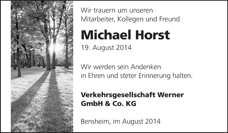 Hier finden Sie alle Traueranzeigen aus der Zeitung, die bisher für Michael Horst erschienen sind. Weitere Traueranzeigen, die in der Zeitung erscheinen, werden hier ebenfalls aufgelistet