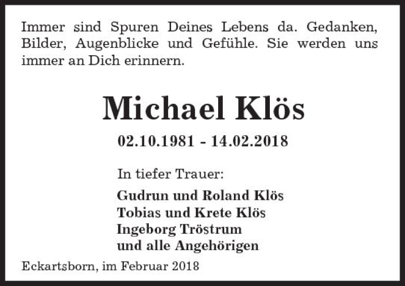 Hier finden Sie alle Traueranzeigen aus der Zeitung, die bisher für Michael Klös erschienen sind. Weitere Traueranzeigen, die in der Zeitung erscheinen, werden hier ebenfalls aufgelistet