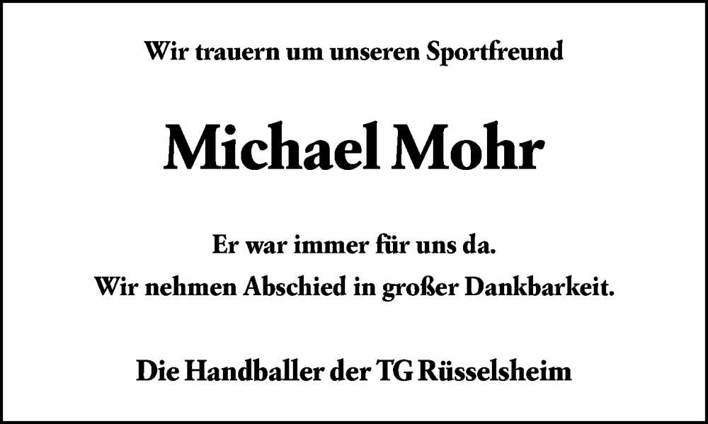 Hier finden Sie alle Traueranzeigen aus der Zeitung, die bisher für Michael Mohr erschienen sind. Weitere Traueranzeigen, die in der Zeitung erscheinen, werden hier ebenfalls aufgelistet