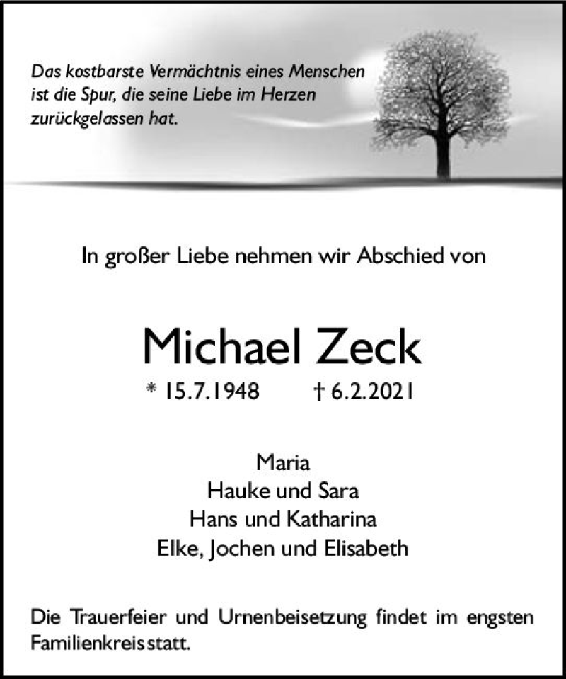 Hier finden Sie alle Traueranzeigen aus der Zeitung, die bisher für Michael Zeck erschienen sind. Weitere Traueranzeigen, die in der Zeitung erscheinen, werden hier ebenfalls aufgelistet