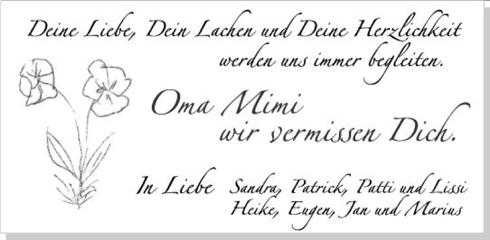 Hier finden Sie alle Traueranzeigen aus der Zeitung, die bisher für Mimi erschienen sind. Weitere Traueranzeigen, die in der Zeitung erscheinen, werden hier ebenfalls aufgelistet