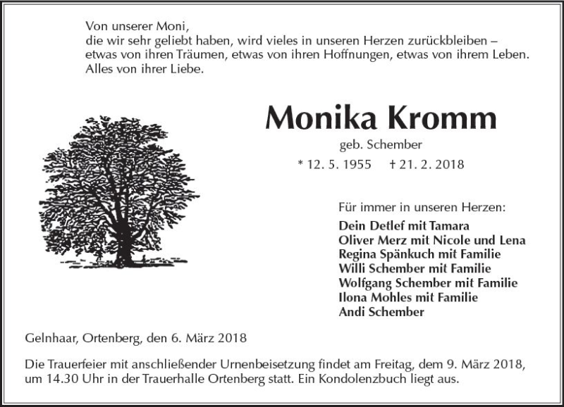 Hier finden Sie alle Traueranzeigen aus der Zeitung, die bisher für Monika Kromm erschienen sind. Weitere Traueranzeigen, die in der Zeitung erscheinen, werden hier ebenfalls aufgelistet