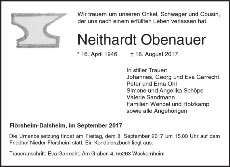 Hier finden Sie alle Traueranzeigen aus der Zeitung, die bisher für Neithardt Obenauer erschienen sind. Weitere Traueranzeigen, die in der Zeitung erscheinen, werden hier ebenfalls aufgelistet