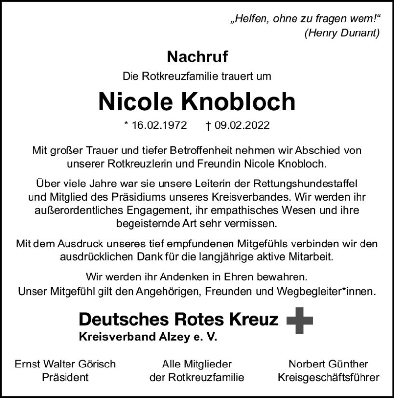 Hier finden Sie alle Traueranzeigen aus der Zeitung, die bisher für Nicole Knobloch erschienen sind. Weitere Traueranzeigen, die in der Zeitung erscheinen, werden hier ebenfalls aufgelistet