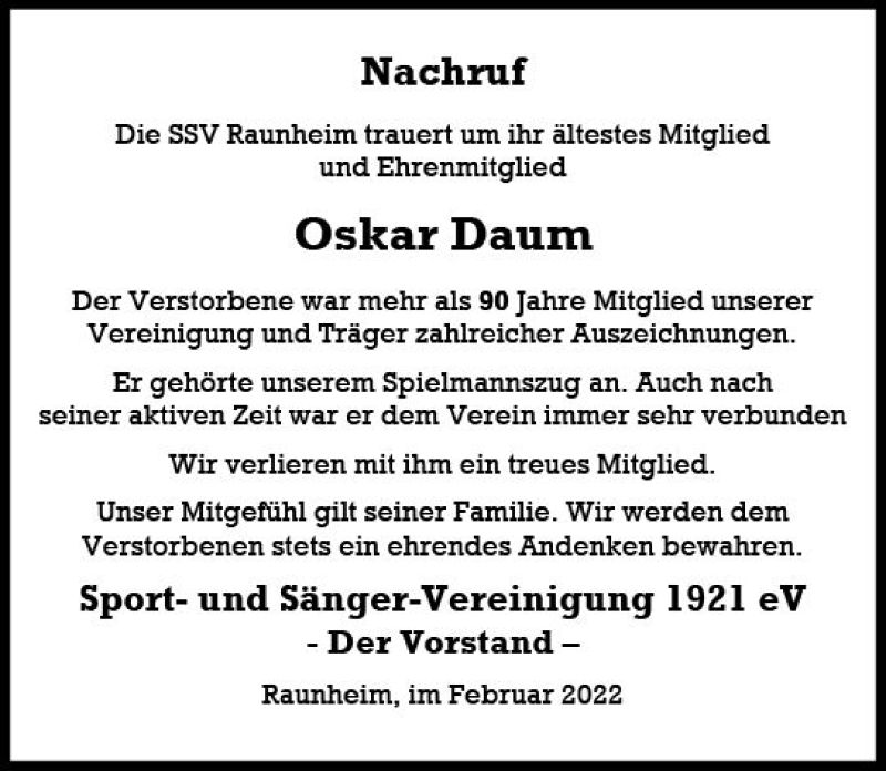 Hier finden Sie alle Traueranzeigen aus der Zeitung, die bisher für Oskar Daum erschienen sind. Weitere Traueranzeigen, die in der Zeitung erscheinen, werden hier ebenfalls aufgelistet