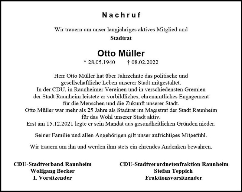 Hier finden Sie alle Traueranzeigen aus der Zeitung, die bisher für Otto Müller erschienen sind. Weitere Traueranzeigen, die in der Zeitung erscheinen, werden hier ebenfalls aufgelistet