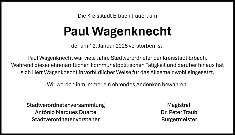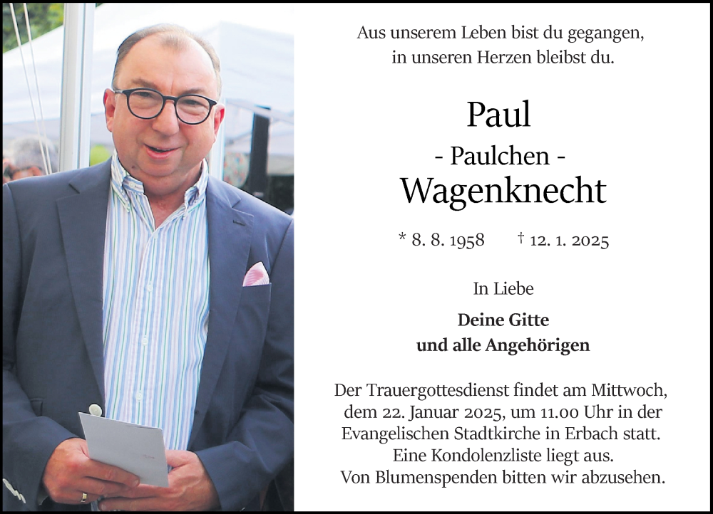 Hier finden Sie alle Traueranzeigen aus der Zeitung, die bisher für Paul Wagenknecht erschienen sind. Weitere Traueranzeigen, die in der Zeitung erscheinen, werden hier ebenfalls aufgelistet