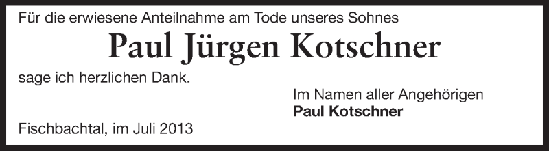 Hier finden Sie alle Traueranzeigen aus der Zeitung, die bisher für Paul Jürgen Kotschner erschienen sind. Weitere Traueranzeigen, die in der Zeitung erscheinen, werden hier ebenfalls aufgelistet