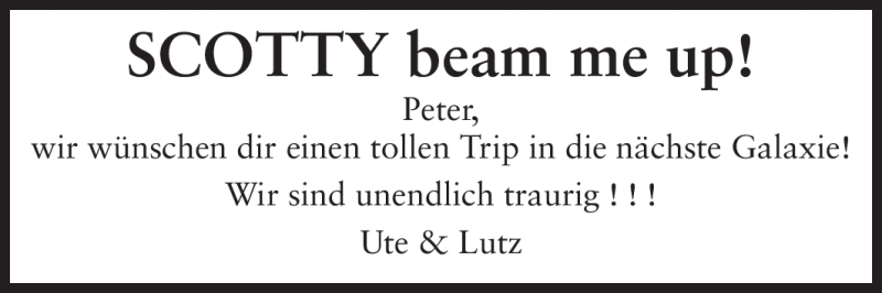 Hier finden Sie alle Traueranzeigen aus der Zeitung, die bisher für Peter erschienen sind. Weitere Traueranzeigen, die in der Zeitung erscheinen, werden hier ebenfalls aufgelistet