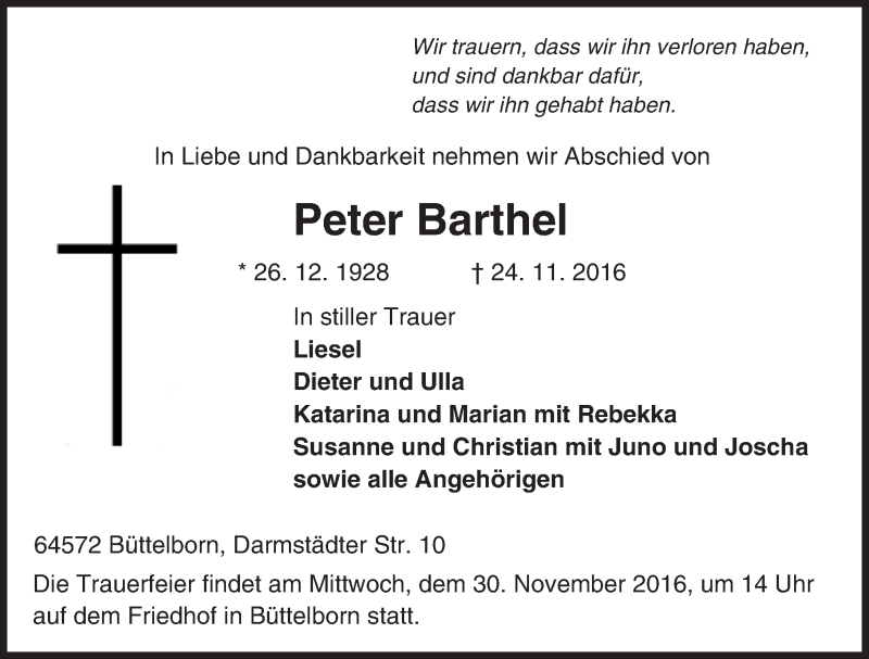 Hier finden Sie alle Traueranzeigen aus der Zeitung, die bisher für Peter Barthel erschienen sind. Weitere Traueranzeigen, die in der Zeitung erscheinen, werden hier ebenfalls aufgelistet