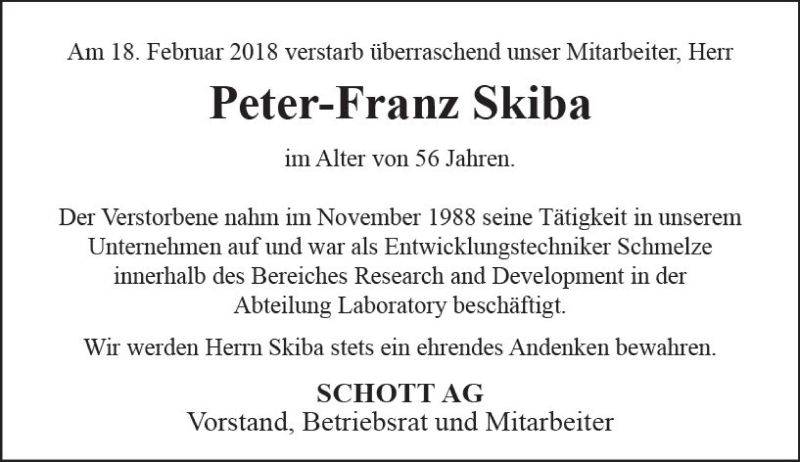 Hier finden Sie alle Traueranzeigen aus der Zeitung, die bisher für Peter-Franz Skiba erschienen sind. Weitere Traueranzeigen, die in der Zeitung erscheinen, werden hier ebenfalls aufgelistet