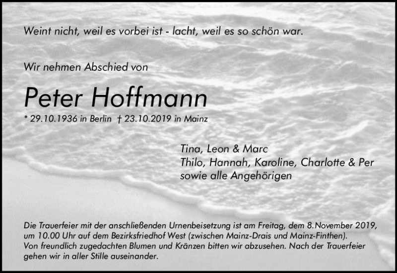 Hier finden Sie alle Traueranzeigen aus der Zeitung, die bisher für Peter Hoffmann erschienen sind. Weitere Traueranzeigen, die in der Zeitung erscheinen, werden hier ebenfalls aufgelistet