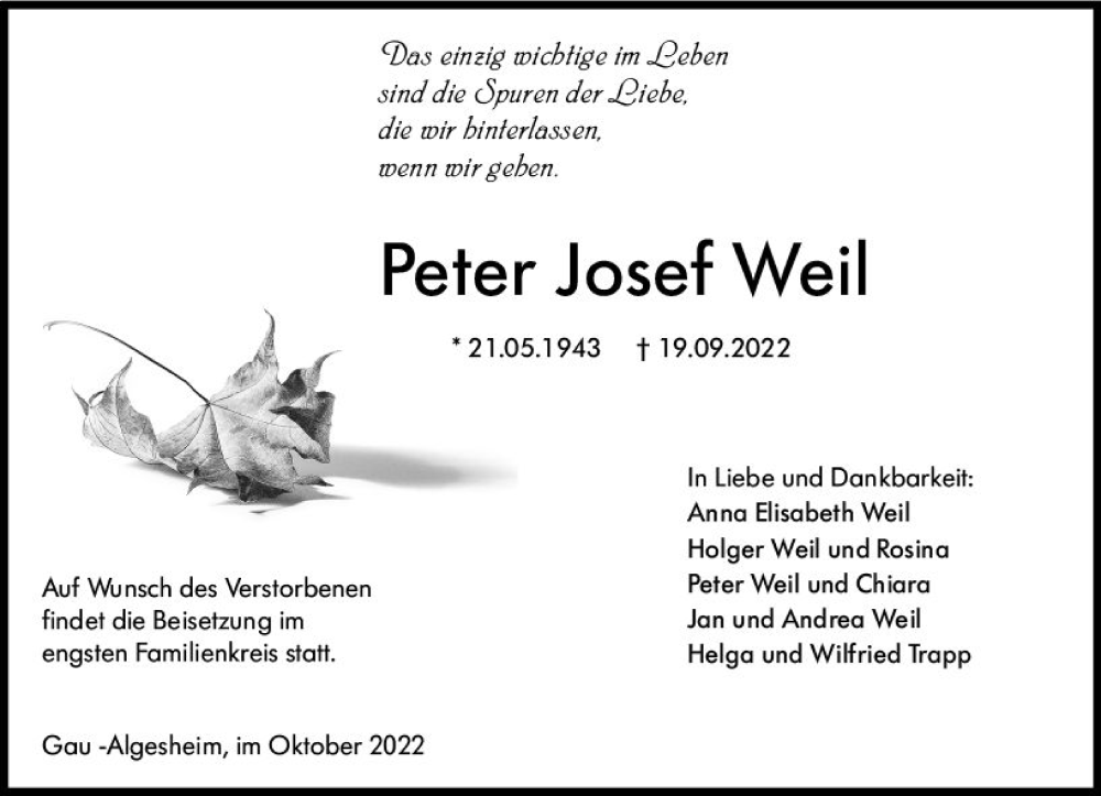Hier finden Sie alle Traueranzeigen aus der Zeitung, die bisher für Peter Josef Weil erschienen sind. Weitere Traueranzeigen, die in der Zeitung erscheinen, werden hier ebenfalls aufgelistet