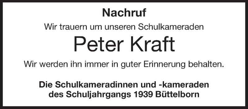 Hier finden Sie alle Traueranzeigen aus der Zeitung, die bisher für Peter Kraft erschienen sind. Weitere Traueranzeigen, die in der Zeitung erscheinen, werden hier ebenfalls aufgelistet