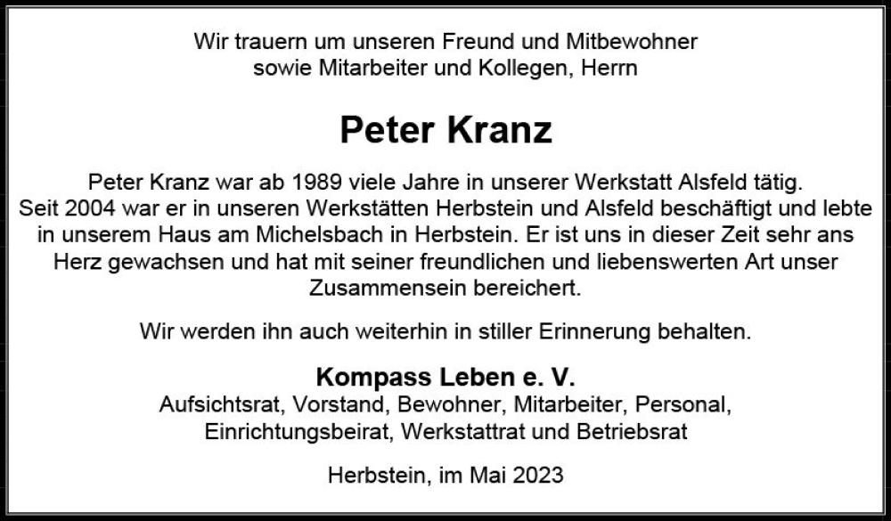 Hier finden Sie alle Traueranzeigen aus der Zeitung, die bisher für Peter Kranz erschienen sind. Weitere Traueranzeigen, die in der Zeitung erscheinen, werden hier ebenfalls aufgelistet