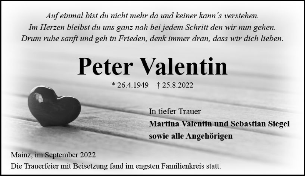 Hier finden Sie alle Traueranzeigen aus der Zeitung, die bisher für Peter Valentin erschienen sind. Weitere Traueranzeigen, die in der Zeitung erscheinen, werden hier ebenfalls aufgelistet