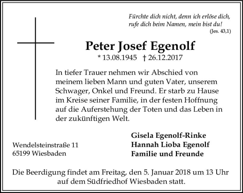 Hier finden Sie alle Traueranzeigen aus der Zeitung, die bisher für Peter Josef Egenolf erschienen sind. Weitere Traueranzeigen, die in der Zeitung erscheinen, werden hier ebenfalls aufgelistet