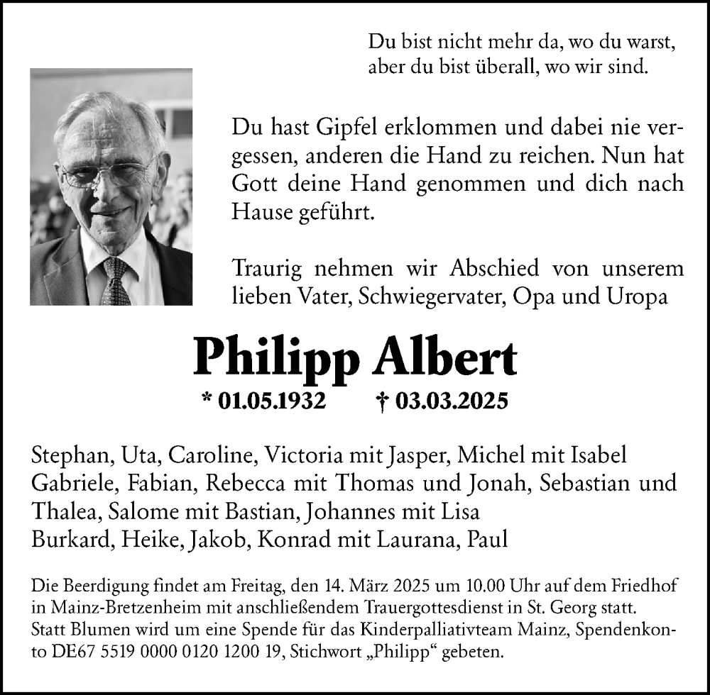 Hier finden Sie alle Traueranzeigen aus der Zeitung, die bisher für Philipp Albert erschienen sind. Weitere Traueranzeigen, die in der Zeitung erscheinen, werden hier ebenfalls aufgelistet