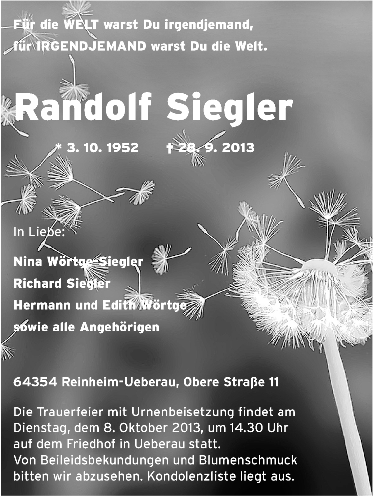 Hier finden Sie alle Traueranzeigen aus der Zeitung, die bisher für Randolf Siegler erschienen sind. Weitere Traueranzeigen, die in der Zeitung erscheinen, werden hier ebenfalls aufgelistet