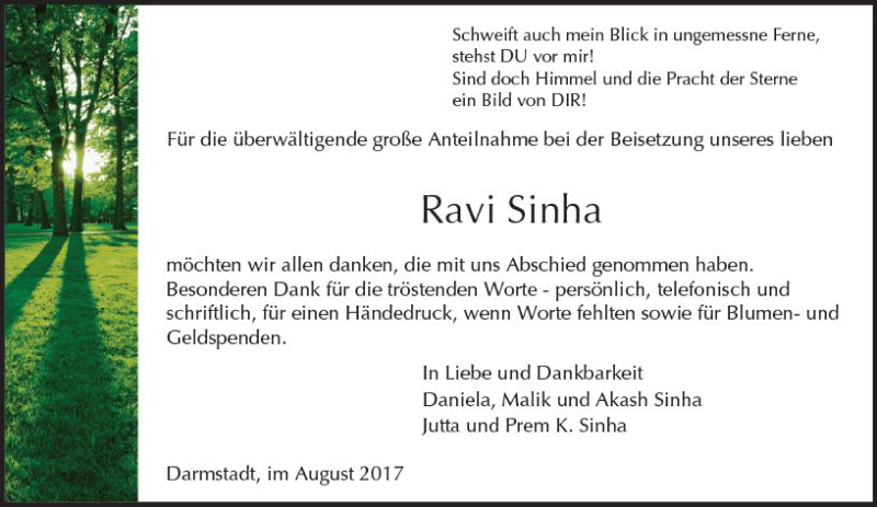 Hier finden Sie alle Traueranzeigen aus der Zeitung, die bisher für Ravi Sinha erschienen sind. Weitere Traueranzeigen, die in der Zeitung erscheinen, werden hier ebenfalls aufgelistet