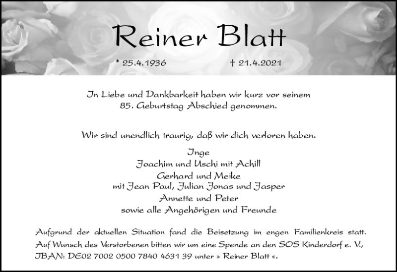 Hier finden Sie alle Traueranzeigen aus der Zeitung, die bisher für Reiner Blatt erschienen sind. Weitere Traueranzeigen, die in der Zeitung erscheinen, werden hier ebenfalls aufgelistet