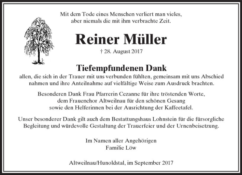 Hier finden Sie alle Traueranzeigen aus der Zeitung, die bisher für Reiner Müller erschienen sind. Weitere Traueranzeigen, die in der Zeitung erscheinen, werden hier ebenfalls aufgelistet