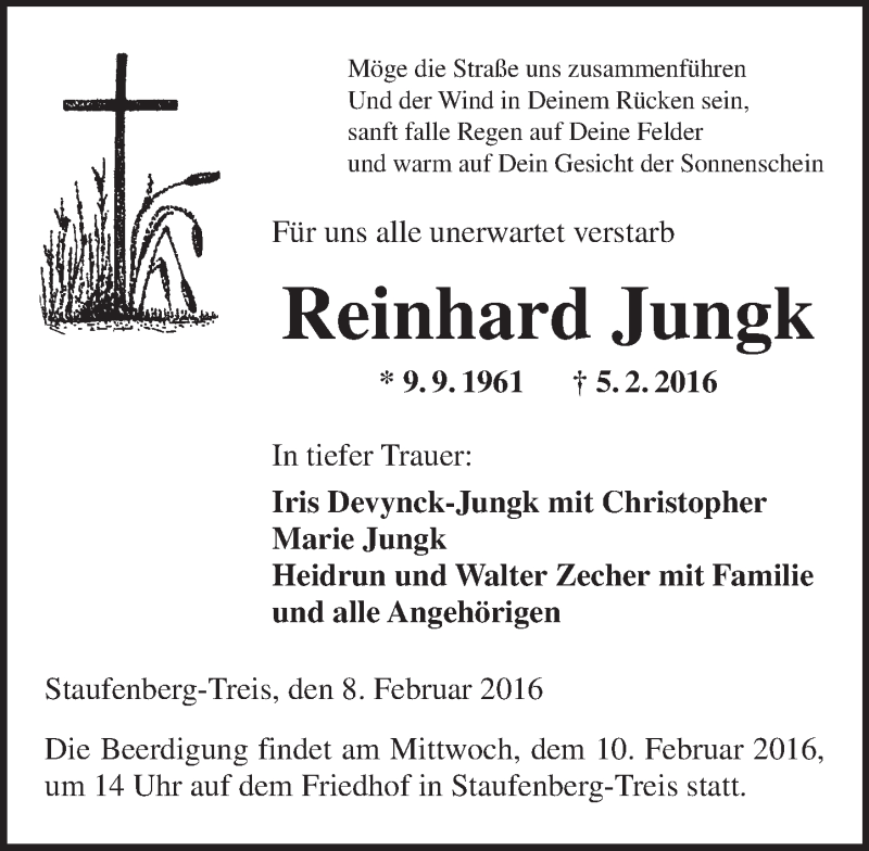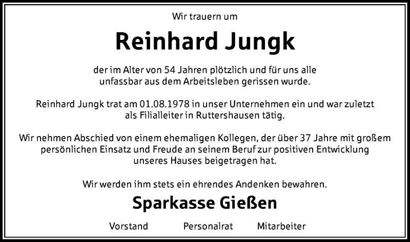 Hier finden Sie alle Traueranzeigen aus der Zeitung, die bisher für Reinhard Jungk erschienen sind. Weitere Traueranzeigen, die in der Zeitung erscheinen, werden hier ebenfalls aufgelistet