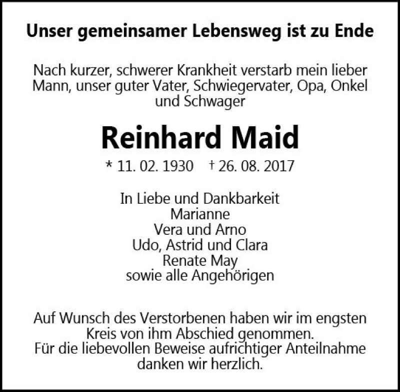 Hier finden Sie alle Traueranzeigen aus der Zeitung, die bisher für Reinhard Maid erschienen sind. Weitere Traueranzeigen, die in der Zeitung erscheinen, werden hier ebenfalls aufgelistet
