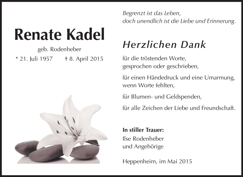 Hier finden Sie alle Traueranzeigen aus der Zeitung, die bisher für Renate Kadel erschienen sind. Weitere Traueranzeigen, die in der Zeitung erscheinen, werden hier ebenfalls aufgelistet