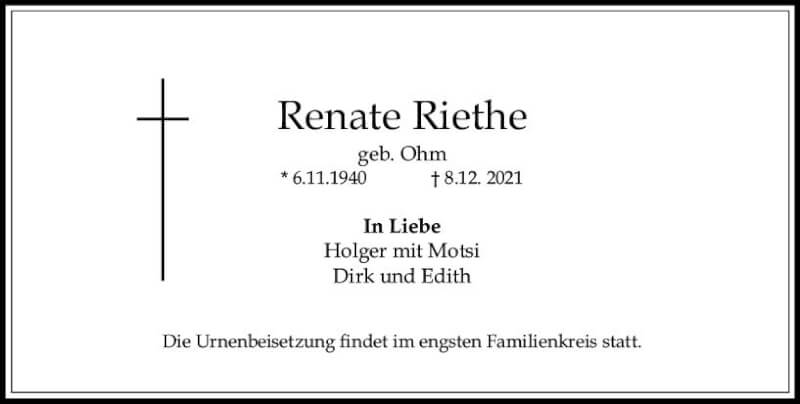 Hier finden Sie alle Traueranzeigen aus der Zeitung, die bisher für Renate Riethe erschienen sind. Weitere Traueranzeigen, die in der Zeitung erscheinen, werden hier ebenfalls aufgelistet