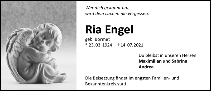 Hier finden Sie alle Traueranzeigen aus der Zeitung, die bisher für Ria Engel erschienen sind. Weitere Traueranzeigen, die in der Zeitung erscheinen, werden hier ebenfalls aufgelistet