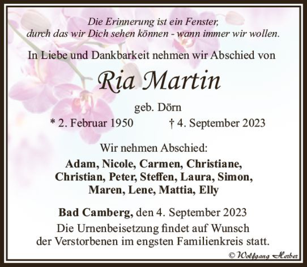 Hier finden Sie alle Traueranzeigen aus der Zeitung, die bisher für Ria Martin erschienen sind. Weitere Traueranzeigen, die in der Zeitung erscheinen, werden hier ebenfalls aufgelistet