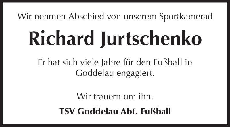 Hier finden Sie alle Traueranzeigen aus der Zeitung, die bisher für Richard Jurtschenko erschienen sind. Weitere Traueranzeigen, die in der Zeitung erscheinen, werden hier ebenfalls aufgelistet