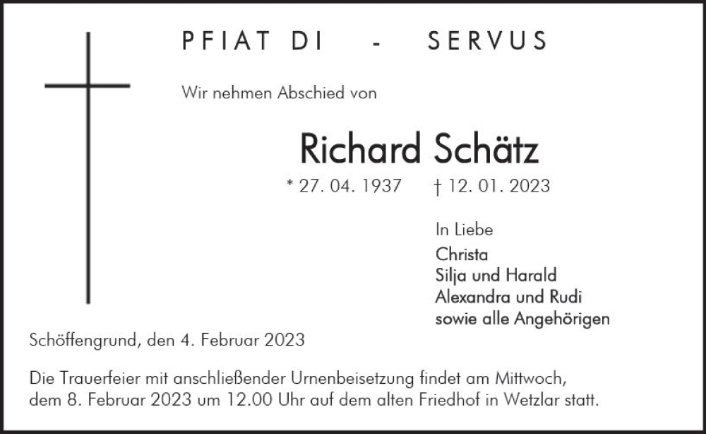 Hier finden Sie alle Traueranzeigen aus der Zeitung, die bisher für Richard Schätz erschienen sind. Weitere Traueranzeigen, die in der Zeitung erscheinen, werden hier ebenfalls aufgelistet