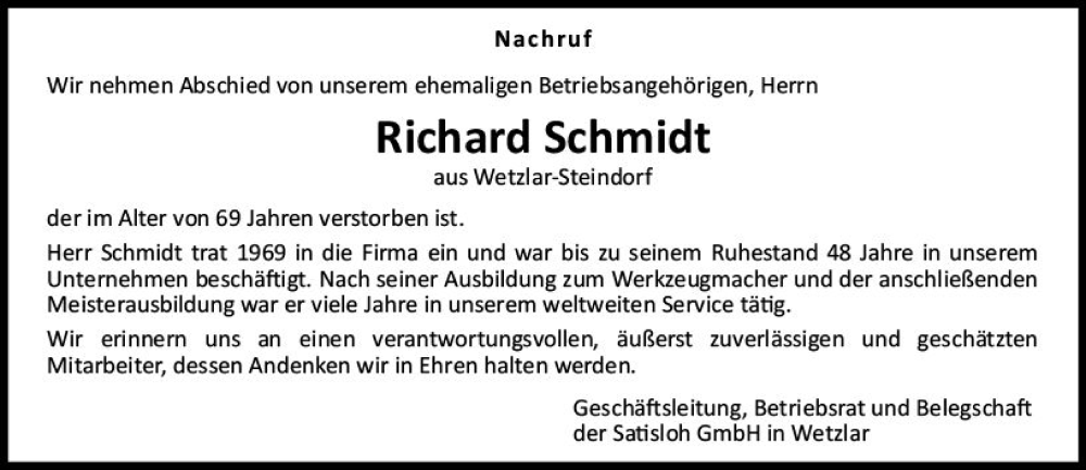 Hier finden Sie alle Traueranzeigen aus der Zeitung, die bisher für Richard Schmidt erschienen sind. Weitere Traueranzeigen, die in der Zeitung erscheinen, werden hier ebenfalls aufgelistet