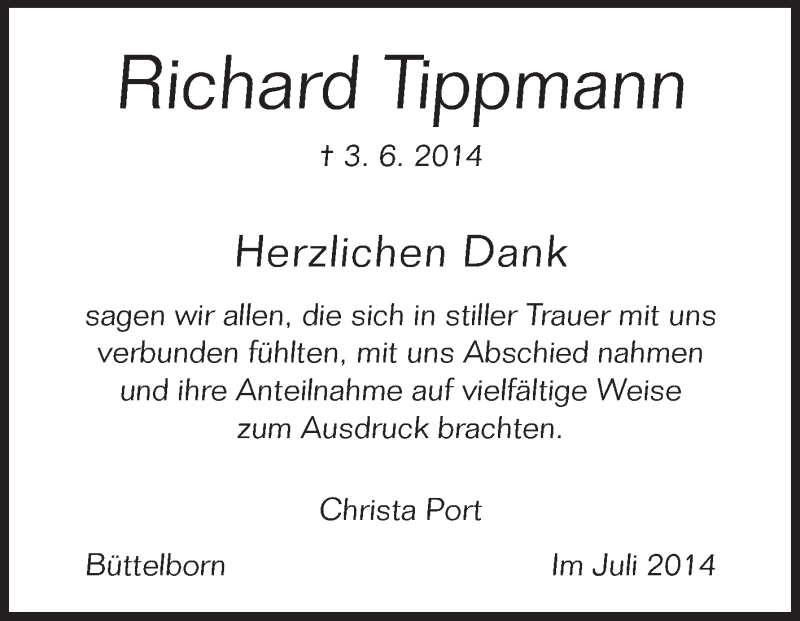 Hier finden Sie alle Traueranzeigen aus der Zeitung, die bisher für Richard Tippmann erschienen sind. Weitere Traueranzeigen, die in der Zeitung erscheinen, werden hier ebenfalls aufgelistet
