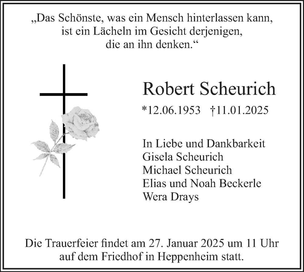 Hier finden Sie alle Traueranzeigen aus der Zeitung, die bisher für Robert Scheurich erschienen sind. Weitere Traueranzeigen, die in der Zeitung erscheinen, werden hier ebenfalls aufgelistet