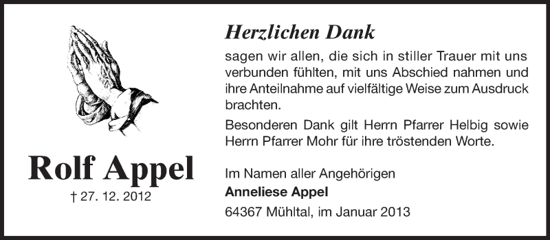 Hier finden Sie alle Traueranzeigen aus der Zeitung, die bisher für Rolf Appel erschienen sind. Weitere Traueranzeigen, die in der Zeitung erscheinen, werden hier ebenfalls aufgelistet