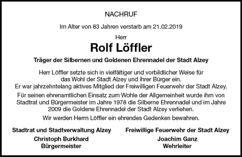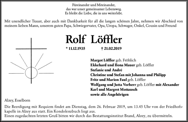 Hier finden Sie alle Traueranzeigen aus der Zeitung, die bisher für Rolf Löffler erschienen sind. Weitere Traueranzeigen, die in der Zeitung erscheinen, werden hier ebenfalls aufgelistet