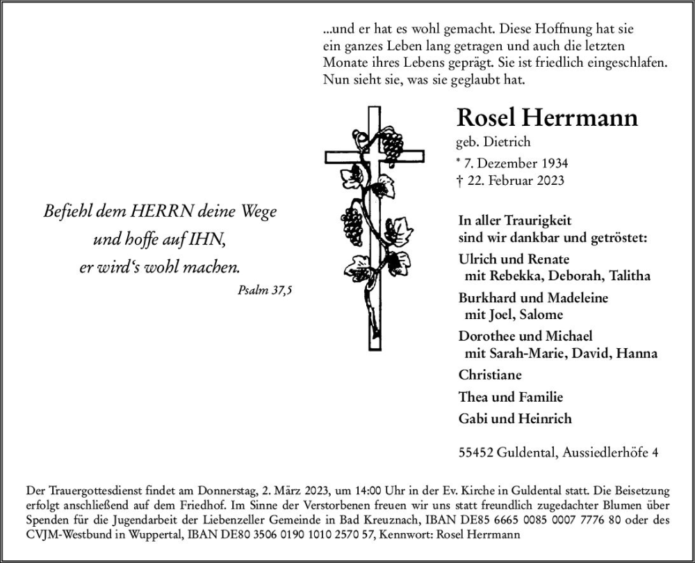 Hier finden Sie alle Traueranzeigen aus der Zeitung, die bisher für Rosel Herrmann erschienen sind. Weitere Traueranzeigen, die in der Zeitung erscheinen, werden hier ebenfalls aufgelistet