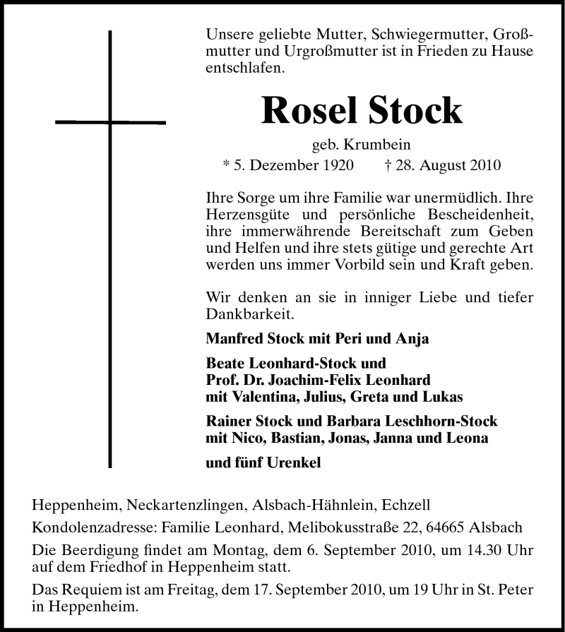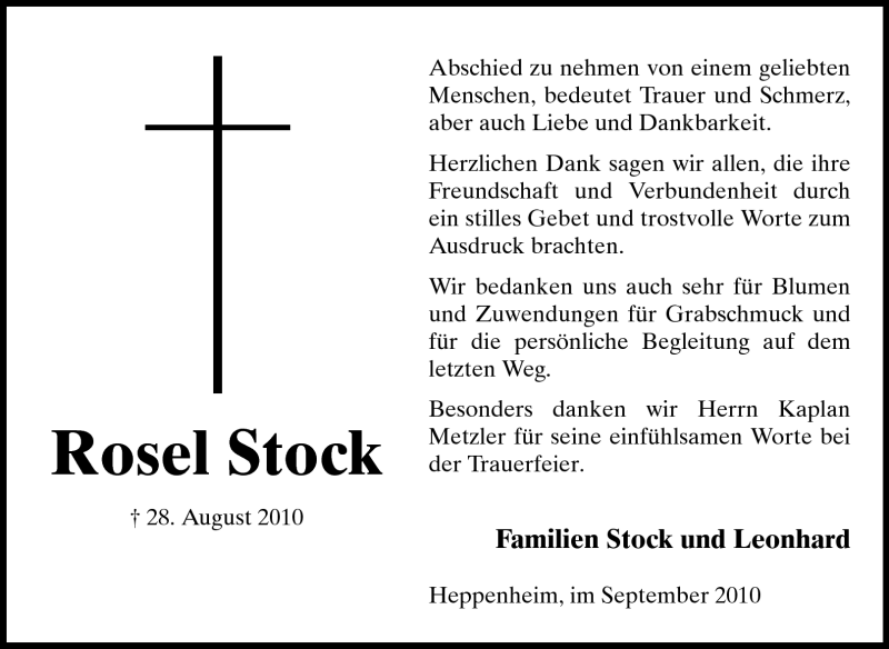 Hier finden Sie alle Traueranzeigen aus der Zeitung, die bisher für Rosel Stock erschienen sind. Weitere Traueranzeigen, die in der Zeitung erscheinen, werden hier ebenfalls aufgelistet