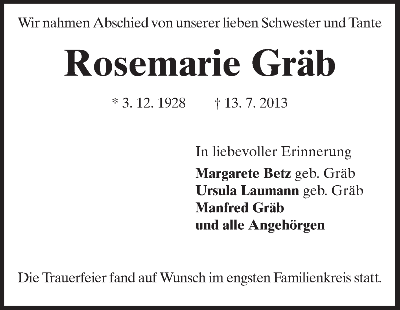 Hier finden Sie alle Traueranzeigen aus der Zeitung, die bisher für Rosemarie Gräb erschienen sind. Weitere Traueranzeigen, die in der Zeitung erscheinen, werden hier ebenfalls aufgelistet