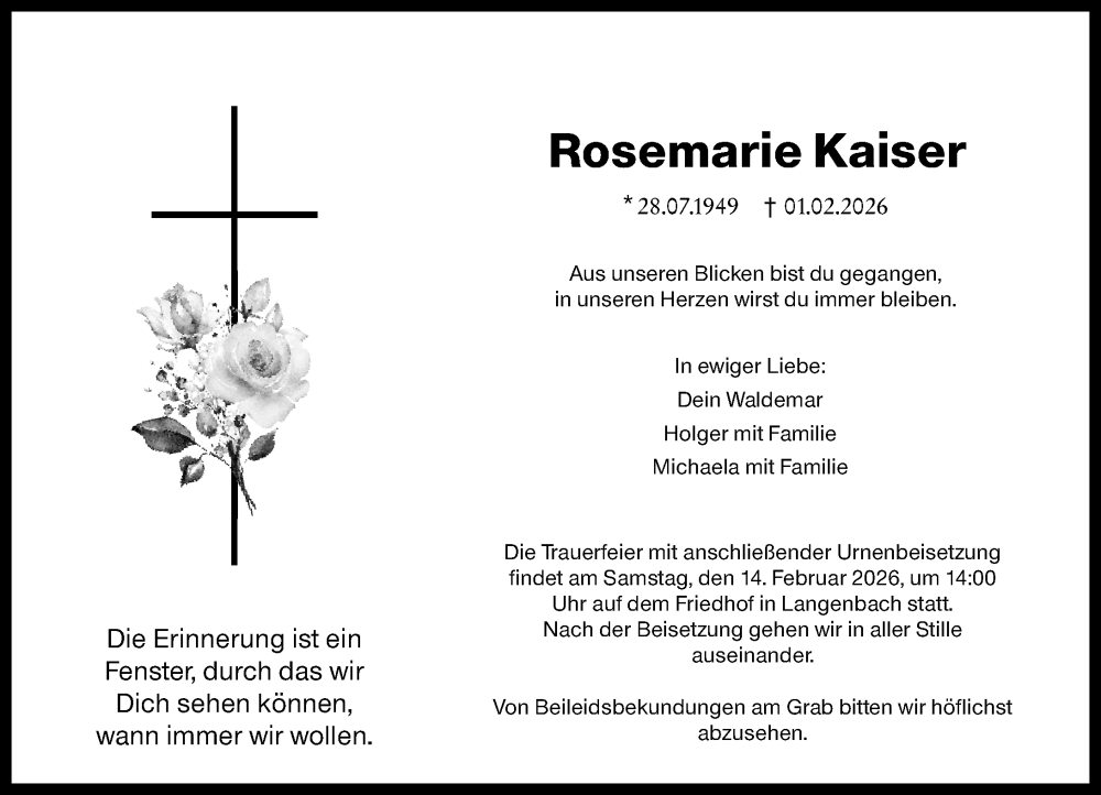 Hier finden Sie alle Traueranzeigen aus der Zeitung, die bisher für Rosemarie Kaiser erschienen sind. Weitere Traueranzeigen, die in der Zeitung erscheinen, werden hier ebenfalls aufgelistet