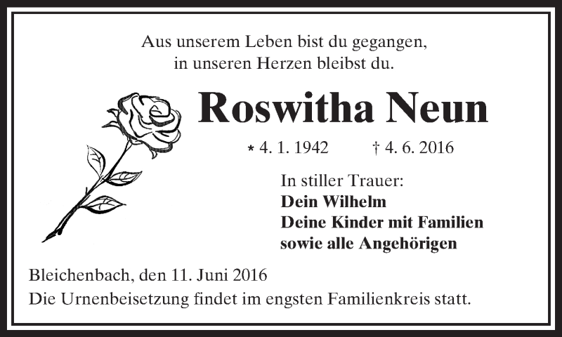 Hier finden Sie alle Traueranzeigen aus der Zeitung, die bisher für Roswitha Neun erschienen sind. Weitere Traueranzeigen, die in der Zeitung erscheinen, werden hier ebenfalls aufgelistet